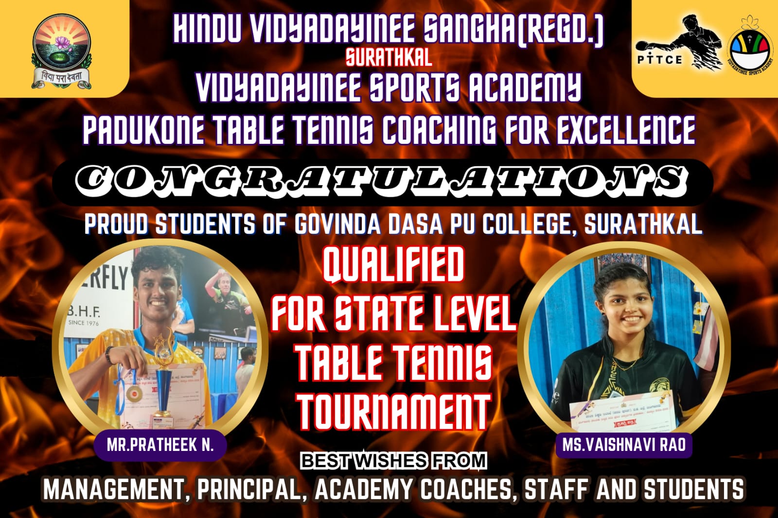 In collaboration with School education department (Pre-University) D.K.,Mangaluru and Govinda Dasa Pre-University College surathkal, organized Mangaluru District Level table tennis tournament on 30th August 2024, in our college auditorium in which P.S. Venkatesh, Main referee, Karnataka Bodybuilding Association was the inaugurator. It was followed by valedictory programme at vidyadayinee sports academy, surathkal. Our proud students Mr.Pratheek N. and Ms.Vaishnavi Rao QUALIFIED TO REPRESENT DAKSHINA KANNADA DISTRICT IN STATE LEVEL TABLE TENNIS TOURNAMENT.